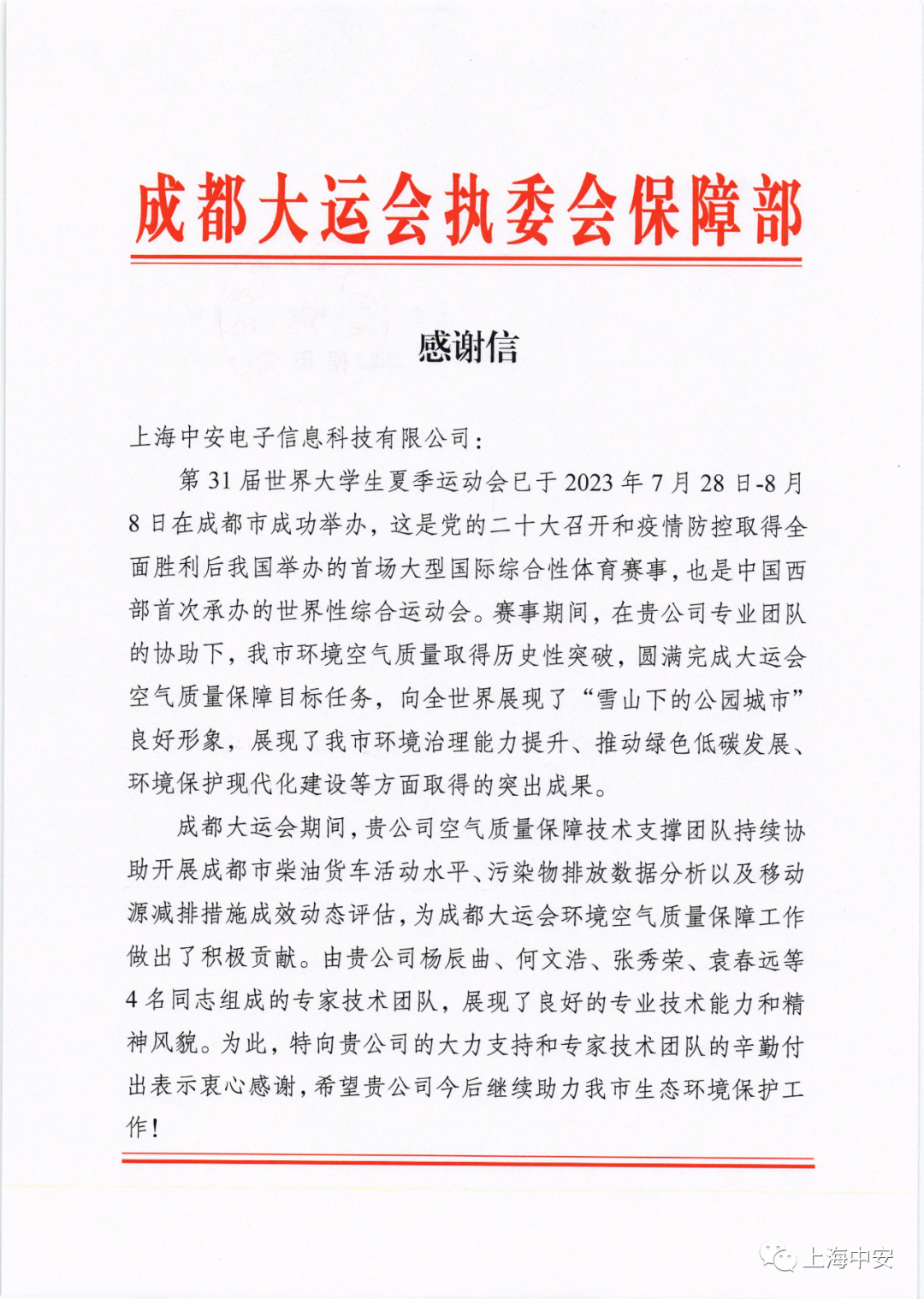 成都大運(yùn)會(huì)執(zhí)委會(huì)保障部發(fā)來一封感謝信!(2023-10-15)
